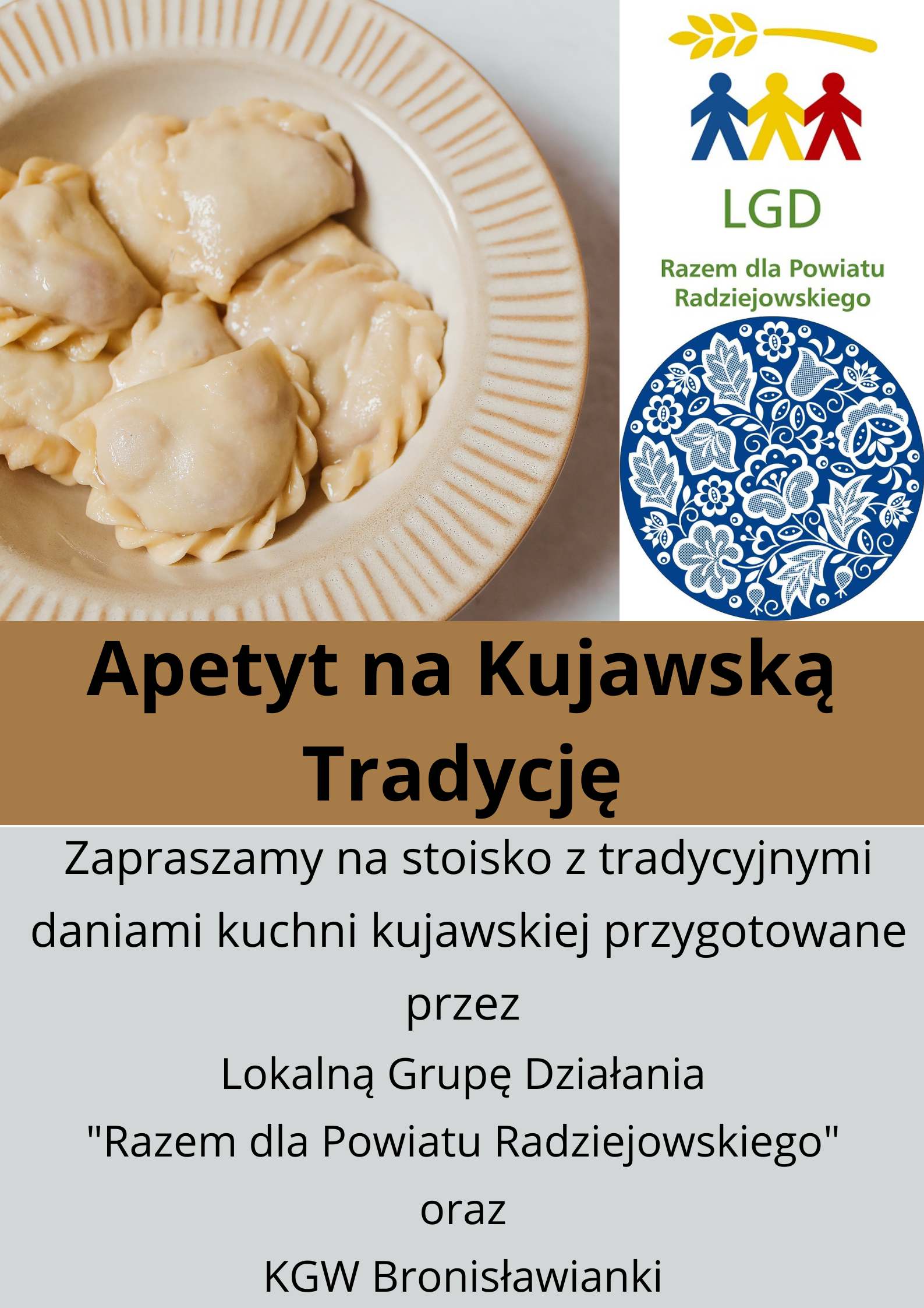 Już 27 sierpnia br. w Płowcach wspólnie z KGW Bronisławianki będziemy częstowali Państwa daniami tradycyjnej kuchni kujawskiej. Wszystkich, którzy chcą przypomnieć sobie smaki dzieciństwa serdecznie zapraszamy. Stoisko jest realizowane w ramach projektu współpracy pn. „Apetyt na kujawską tradycję” współfinansowanego ze środków Unii Europejskiej w ramach poddziałania 19.3 „Przygotowanie i realizacja działań w zakresie współpracy z lokalną grupą działania” objętego Programem Rozwoju Obszarów Wiejskich na lata 2014-2020”.