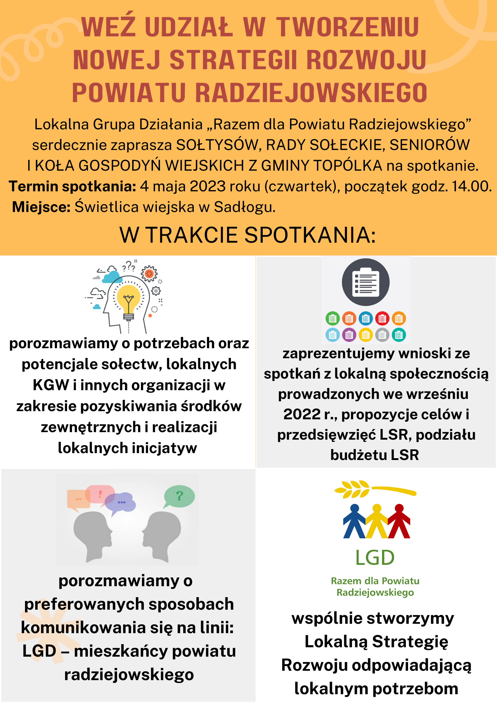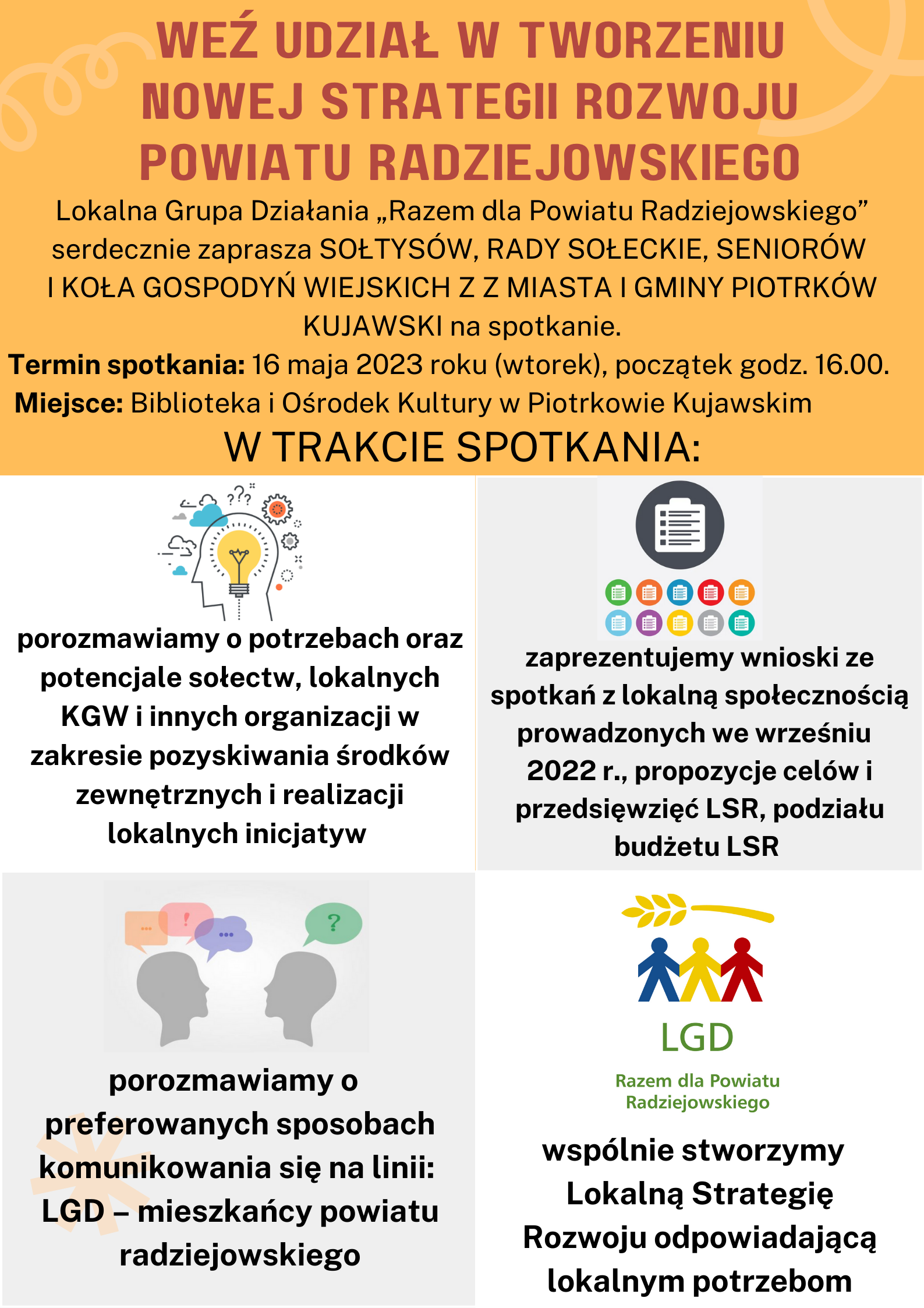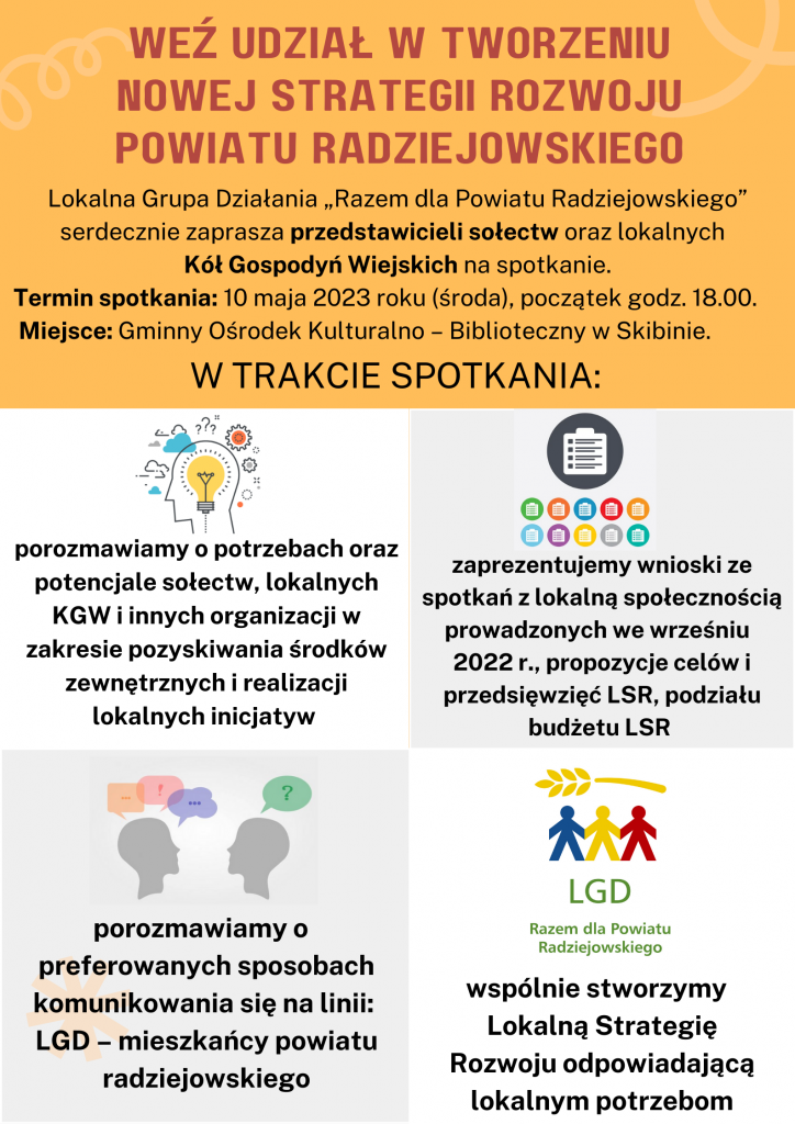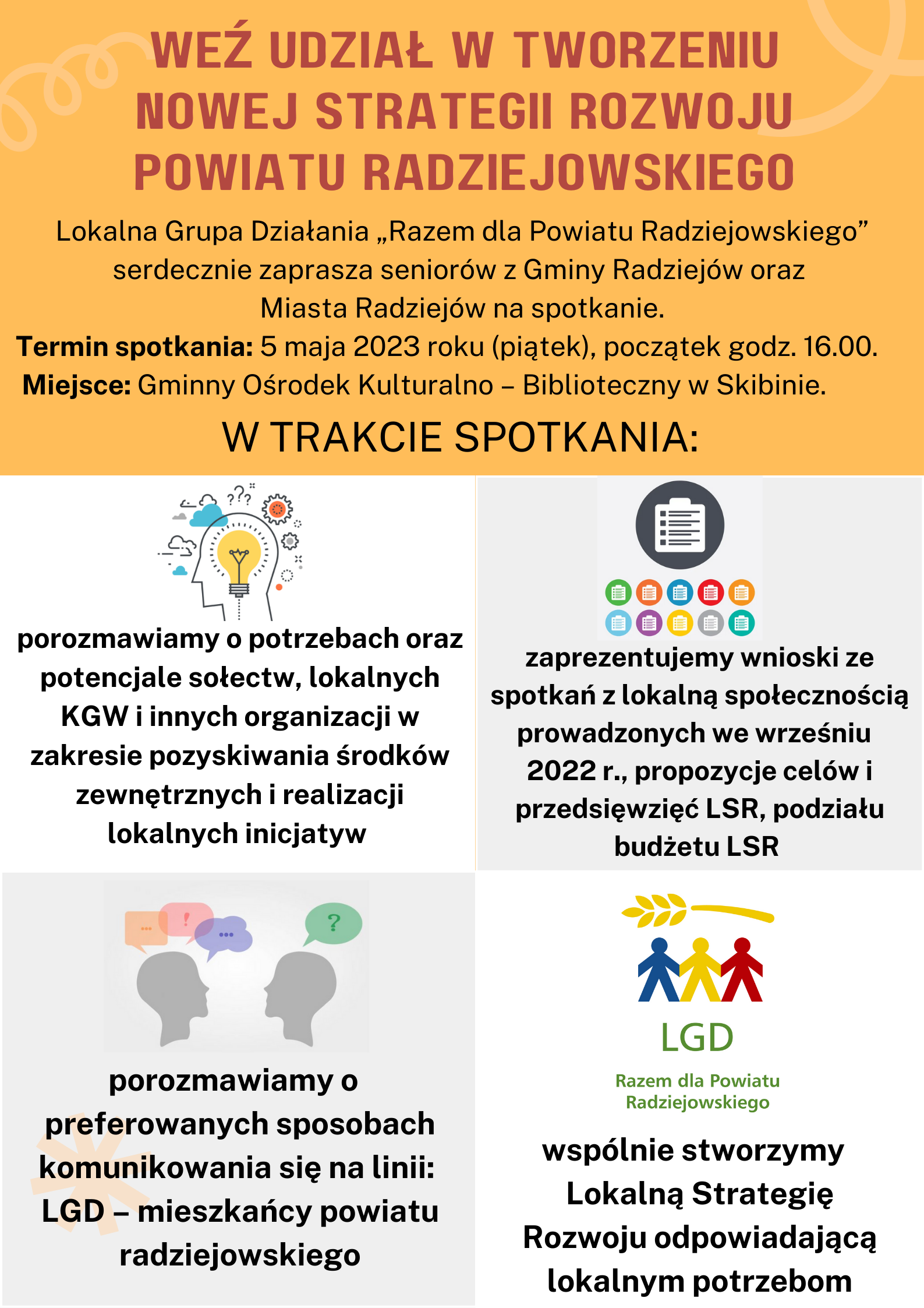 Lokalna Grupa Działania „Razem dla Powiatu Radziejowskiego” ponownie zaprasza mieszkańców, przedstawicieli sołectw, rad sołeckich oraz lokalnych Kół Gospodyń Wiejskich oraz seniorów na spotkania konsultacyjne.