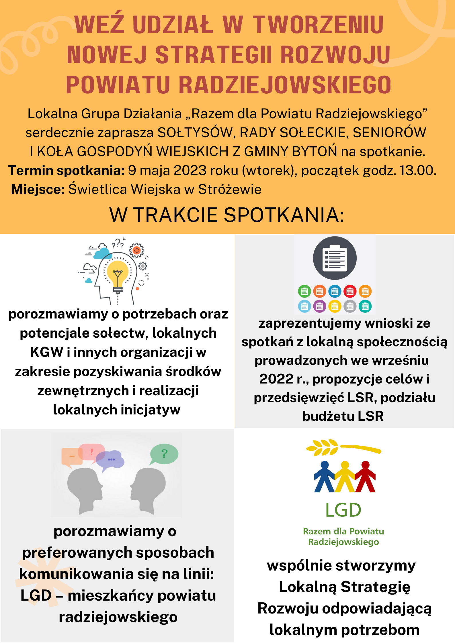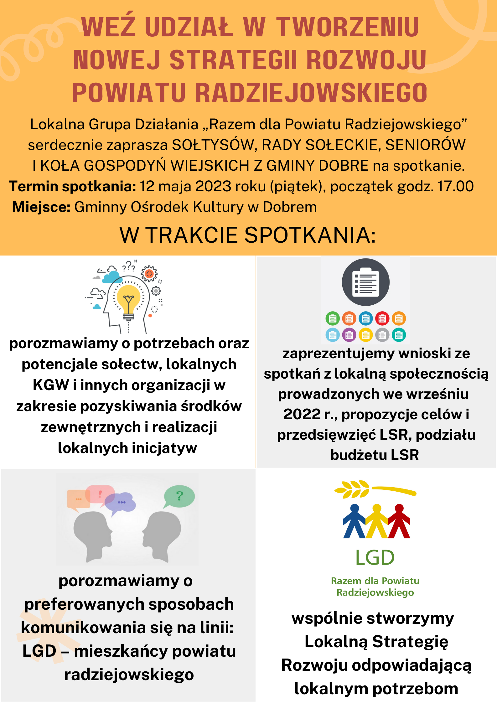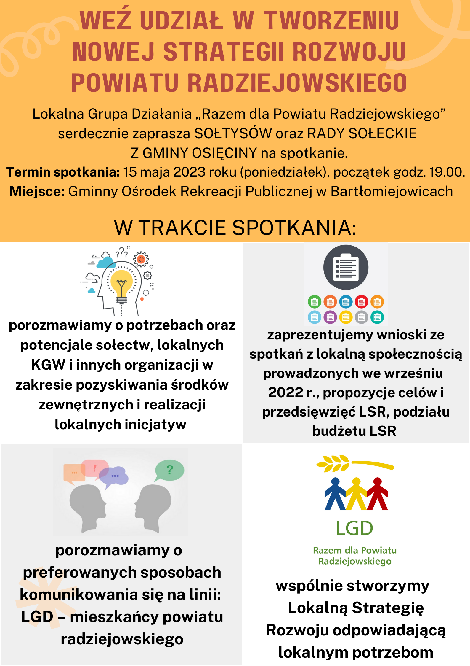 Lokalna Grupa Działania „Razem dla Powiatu Radziejowskiego” ponownie zaprasza mieszkańców, przedstawicieli sołectw, rad sołeckich oraz lokalnych Kół Gospodyń Wiejskich oraz seniorów na spotkania konsultacyjne.
