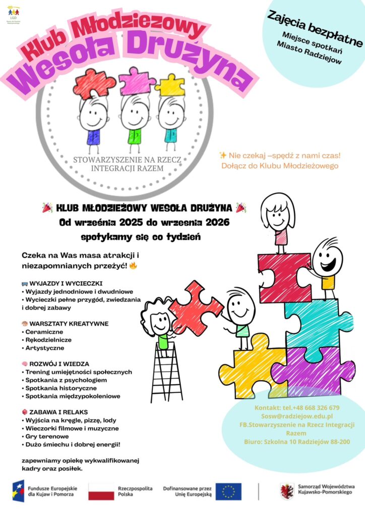 Stowarzyszenie na Rzecz Integracji RAZEM zapraszam dzieci i młodzież (6–24 lata) z miasta i gminy Radziejów do udziału w Młodzieżowym Klubie Wesoła Drużyna ! 💬🎨🎯