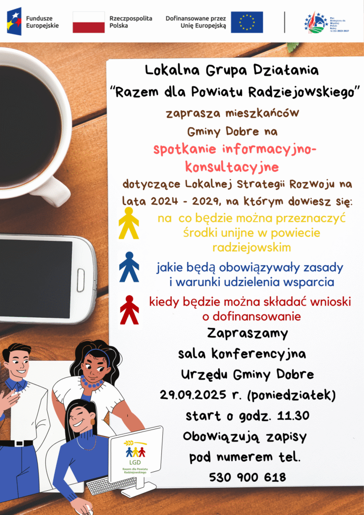 na spotkanie informacyjno-konsultacyjne, dotyczące nowej Strategii Rozwoju Lokalnego kierowanego przez społeczność dla obszaru Powiatu Radziejowskiego na lata 2024-2029.